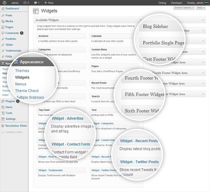 Available default widget area – Blog Sidebar, Portfolio Single Sidebar, First Footer Widget Area, Second Footer Widget Area, Third Footer Widget Area, Fourth Footer Widget Area, Fifth Footer Widget Area and Sixth Footer Widget Area.