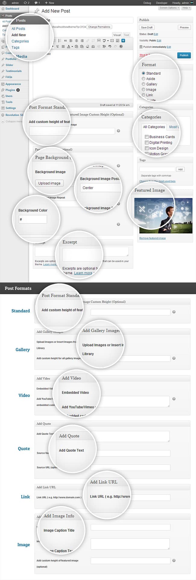 UltraWebStudio theme supports seven post formats – Standard, Aside, Gallery, Image, Link, Quote and Video. It follows standard rules for blog posts so you can easily change your old blog with this theme. You can manage blog page from theme options panel which has lots of necessary options like disable/enable date, author, categories, tags, excerpt, comment count, read more link etc. You can give pagination, exclude specific categories, manage excerpt characters length from theme options panel. You can also disable/enable comments, About Author info and share link for post single page.