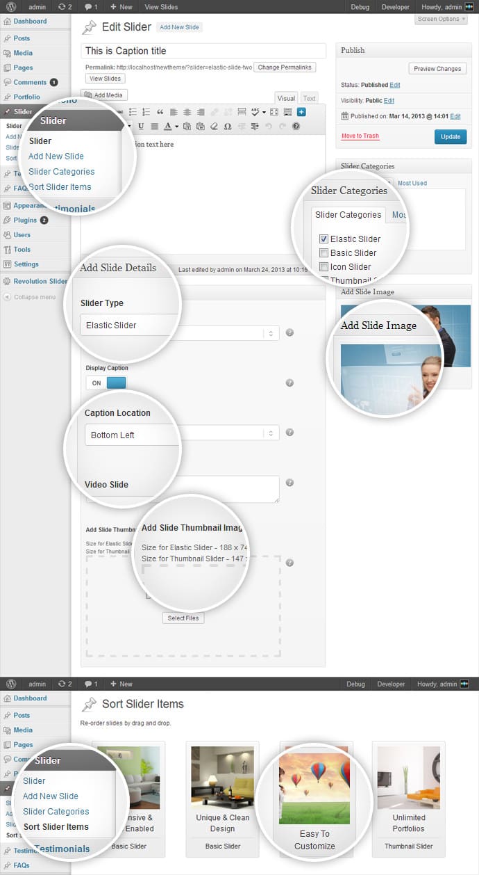 UltraWebStudio theme has custom slider post type which has user friendly options to add slides. It uses WordPress default features like title, content, image attachment and categorie. You can create unlimited sliders in four style – Default, Thumbnail, Icon and Basic. You can add image or video in slide. You can add caption and set to left-right top and bottom position. You can give hyperlink on slide image. You can upload separate thumbnail image for specific slide from meta boxes. UltraWebStudio has visual drag and drop re-order page which makes faster to re-order all slider slides.