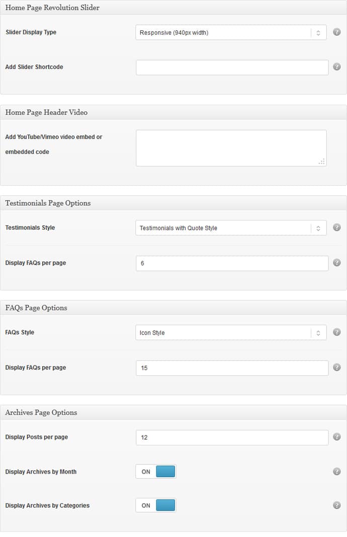 UltraWebStudio theme has many ready templates for sub pages like faq, archives, testimonials, home with revolution slider, home with image or video header etc. You can set display setting of each page with advanced options like above screenshot.